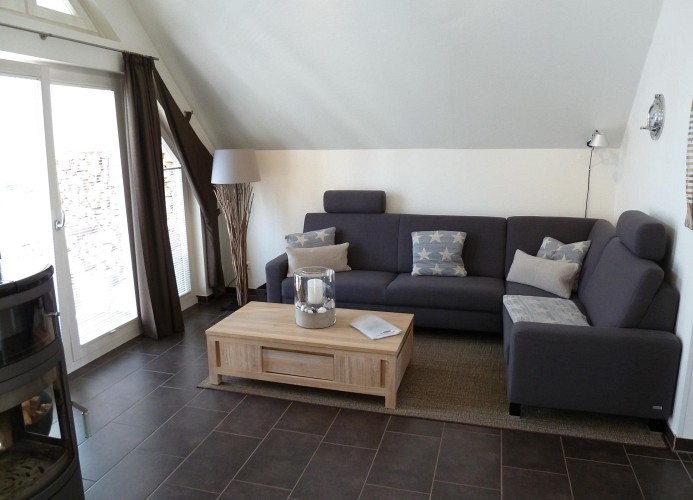 Zu der Ausstattung gehören drei Schlafzimmer, eine offene Küche, zwei Bäder und ein Wohnzimmer mit Kamin. Ein, zur Wohnung gehörender, Parkplatz finden Sie direkt neben dem Haus. Die Treppe ist mit einen Kinderschutz versehen.